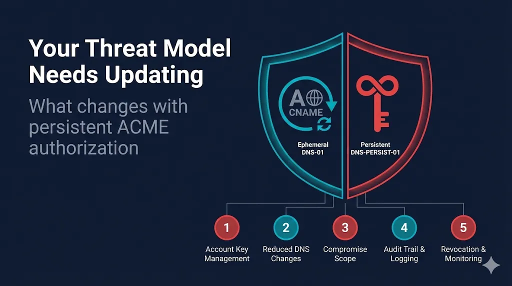 Five security assumptions that change when certificate validation becomes persistent — and what to do about each one. A practitioner-level companion to our DNS-PERSIST-01 technical guide.