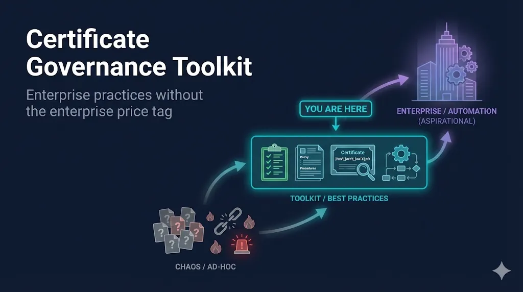 Most organizations live in this gap for years. You know you need better governance. You're not ready for (or can't justify) a six-figure platform. So certificates get managed in people's heads, scattered documents, and hope.