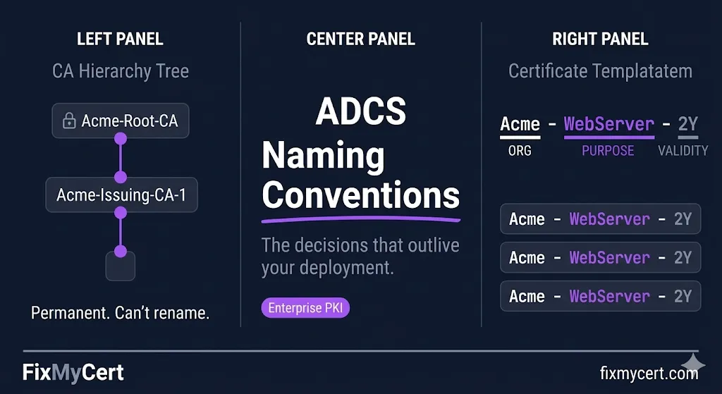 A comprehensive guide to the five naming decisions that outlive every ADCS deployment — CA hierarchy names, certificate template naming, subject fields, CRL/AIA URLs, and AD object names.