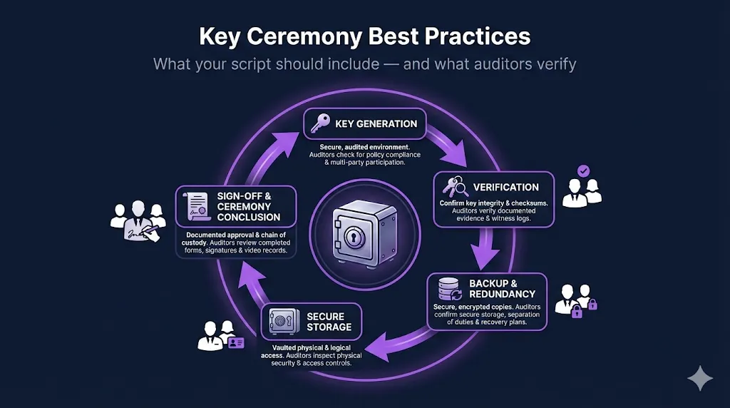 We published a deep-dive blog post on key ceremony scripts — the formal, witnessed process of generating cryptographic keys for a Certificate Authority. This isn't the academic "what is a key ceremony" overview you find elsewhere. It's a practitioner's breakdown of what your script should actually contain: pre-ceremony checklists, HSM operations structure, key backup procedures, witness requirements, and the specific documentation gaps that generate audit findings. The post includes five custom infographics — roles diagram, pre-ceremony checklist flow, ceremony script flow, audit red flags, and common mistakes — plus a video walkthrough. We also added cross-links from 6 related pages (HSM guide, CA Hierarchy guide, What Is a CPS guide, Internal CA CPS blog, and PCI DSS checklist) so readers can discover it naturally.
