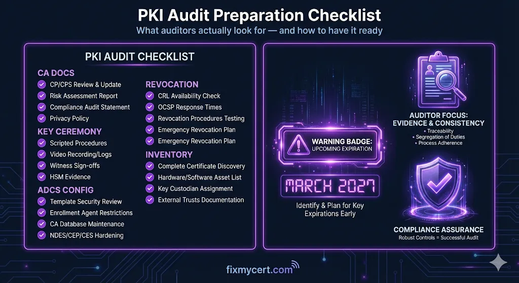 PKI audits fail for predictable reasons: missing governance documents, gaps between inventory and discovery scans, expired CRLs nobody noticed, and team members who can't explain the certificate lifecycle. This checklist addresses every one of those failure modes. It's organized around the nine areas auditors actually examine — from CP/CPS documentation through HSM access logs to interview preparation — with specific evidence artifacts to gather and common findings to preempt. Whether you're facing a SOC 2, PCI DSS, WebTrust, or internal security review, this checklist ensures nothing falls through the cracks.