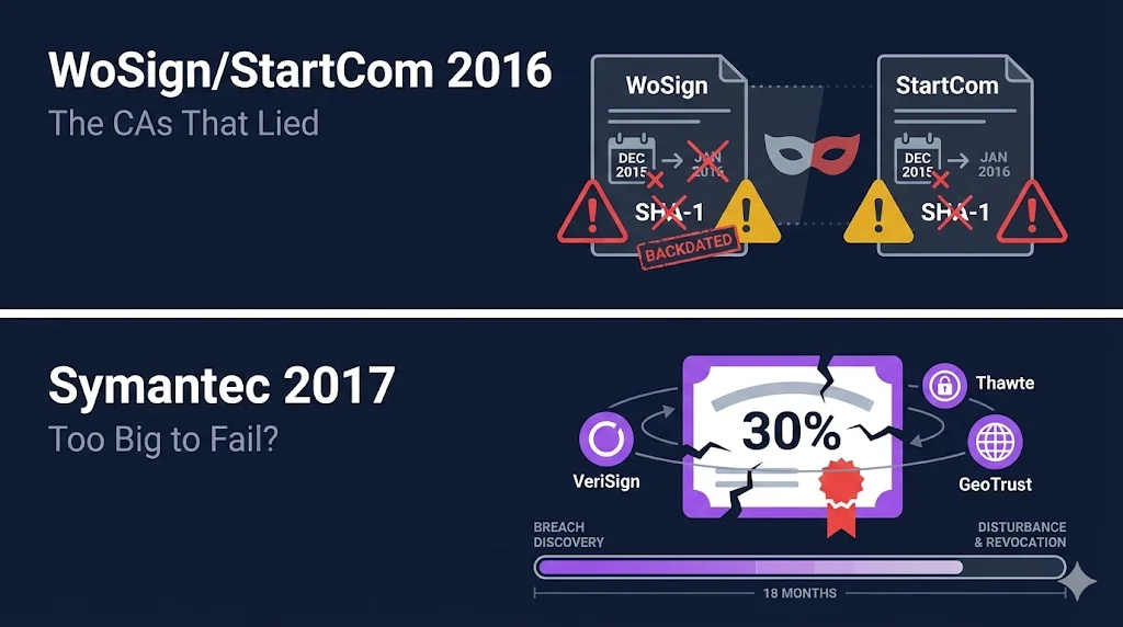 The PKI Disasters Hall of Fame is now complete with four in-depth case studies spanning 13 years of certificate authority failures. From DigiNotar's catastrophic 2011 breach that may have cost lives in Iran, to WoSign's brazen backdating scheme, Symantec's "too big to fail" moment that proved no CA is untouchable, and Entrust's 2024 compliance saga—each story shows how quickly trust can evaporate. Whether you're managing certificates for a startup or an enterprise, these lessons will help you avoid becoming the next cautionary tale.