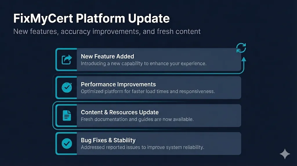 Search engines need clear signals to rank your content. We audited every page on FixMyCert and found dozens of meta descriptions under 120 characters, page titles over 60 characters, broken internal links, and missing image alt text. Every issue has been fixed — descriptions now fall in the 120-155 character sweet spot, titles are concise and keyword-rich, and all internal links resolve correctly.